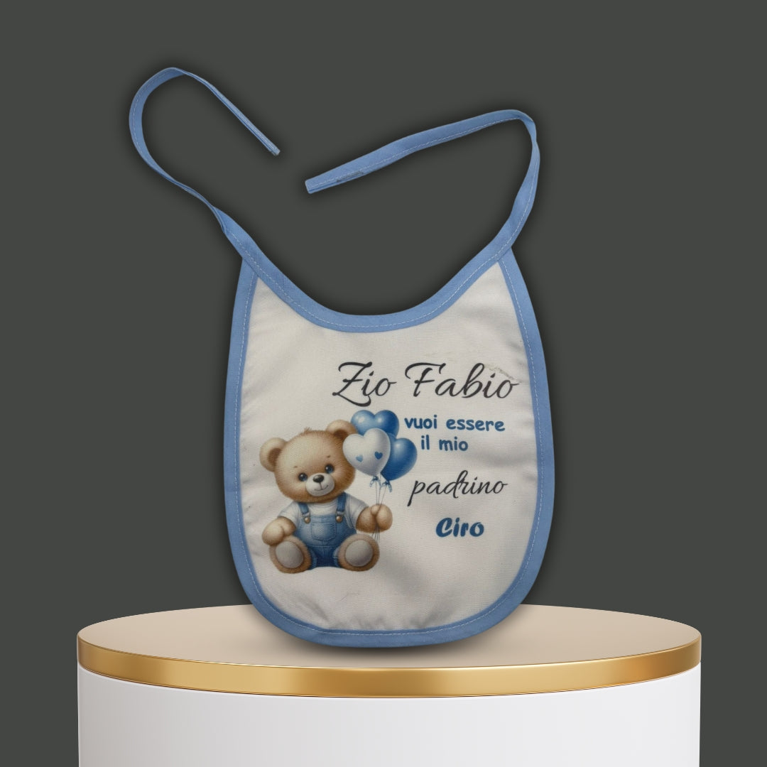 Bavaglino celeste''Orsetto'' personalizzabile con dedica '' VUOI ESSERE LA MIA MADRINA ''